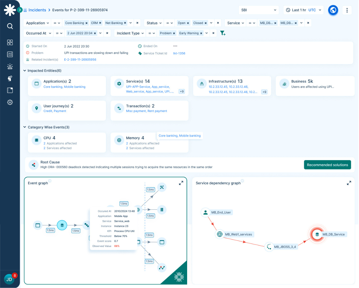 Identifies the root cause of incidents by cutting through alert floods and ITSM noise, reducing time in war rooms.